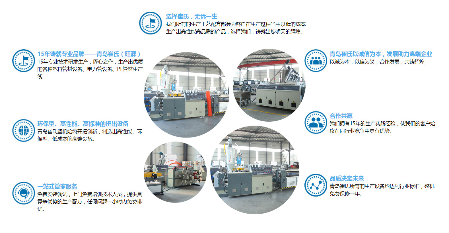 青島崔氏塑料機(jī)械:生產(chǎn)的預(yù)應(yīng)力塑料波紋管設(shè)備、電力管設(shè)備、塑料波紋管設(shè)備、汽車(chē)線束波紋管設(shè)備、PPR、PE、PVC、PERT管材設(shè)備及其它各種管材設(shè)備、塑料型材設(shè)備、塑料蜂窩板設(shè)備, 遠(yuǎn)銷(xiāo):歐州,獨(dú)聯(lián)體,南美洲,中東,東南亞,大洋州,非洲等地的20多個(gè)國(guó)家和地區(qū)。